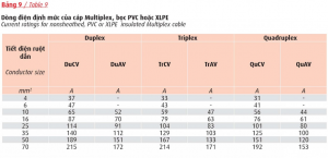 Dòng điện định mức và độ sụt áp của cáp điện kế ruột đồng cách điện PVC, vỏ PVC – ký hiệu DK – CVV: